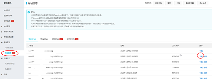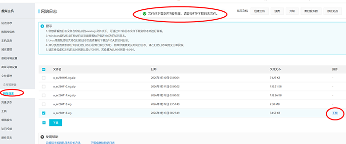 1、NGINX架构下的虚拟主机日志下载有两种办法一种是通过虚拟主机管理平台,另一种是通过FTP软件,连接通后在在您站点的wwwlogs文件夹下找到对应的日志并下载,两种办法结果一样,下面以阿里云虚拟主机平台上下载为例说明