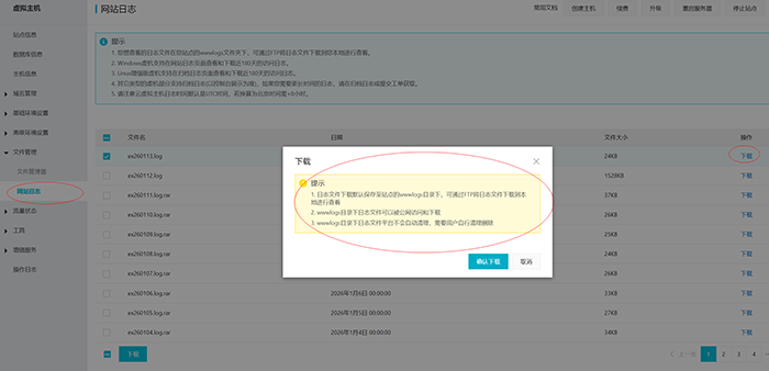 2. Windows虚机支持在网站日志页面查看和下载近180天的访问日志。